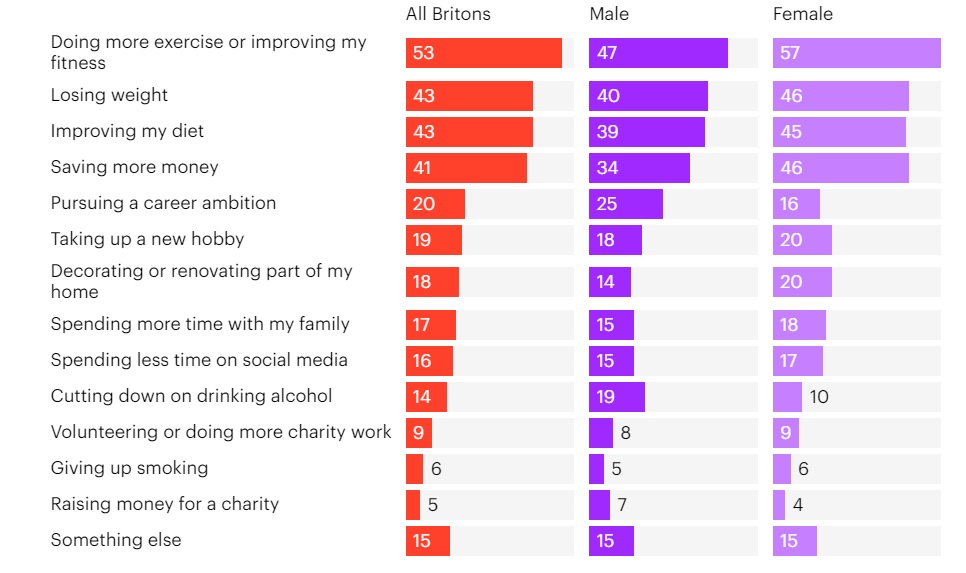 These more obvious new year’s resolutions are lower down the list than expected. Perhaps this is because fewer people smoke today than in previous years, and drinking has become expensive – a clear barrier when food is a higher priority.