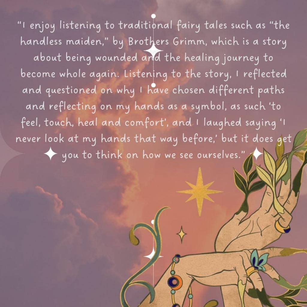 “I enjoy listening to traditional fairy tales such as “the handless maiden,” by Brothers Grimm, which is a story about being wounded and the healing journey to become whole again. Listening to the story, I reflected and questioned on why I have chosen different paths and reflecting on my hands as a symbol, as such ‘to feel, touch, heal and comfort’, and I laughed saying ‘I never look at my hands that way before,’ but it does get you to think on how we see ourselves.”