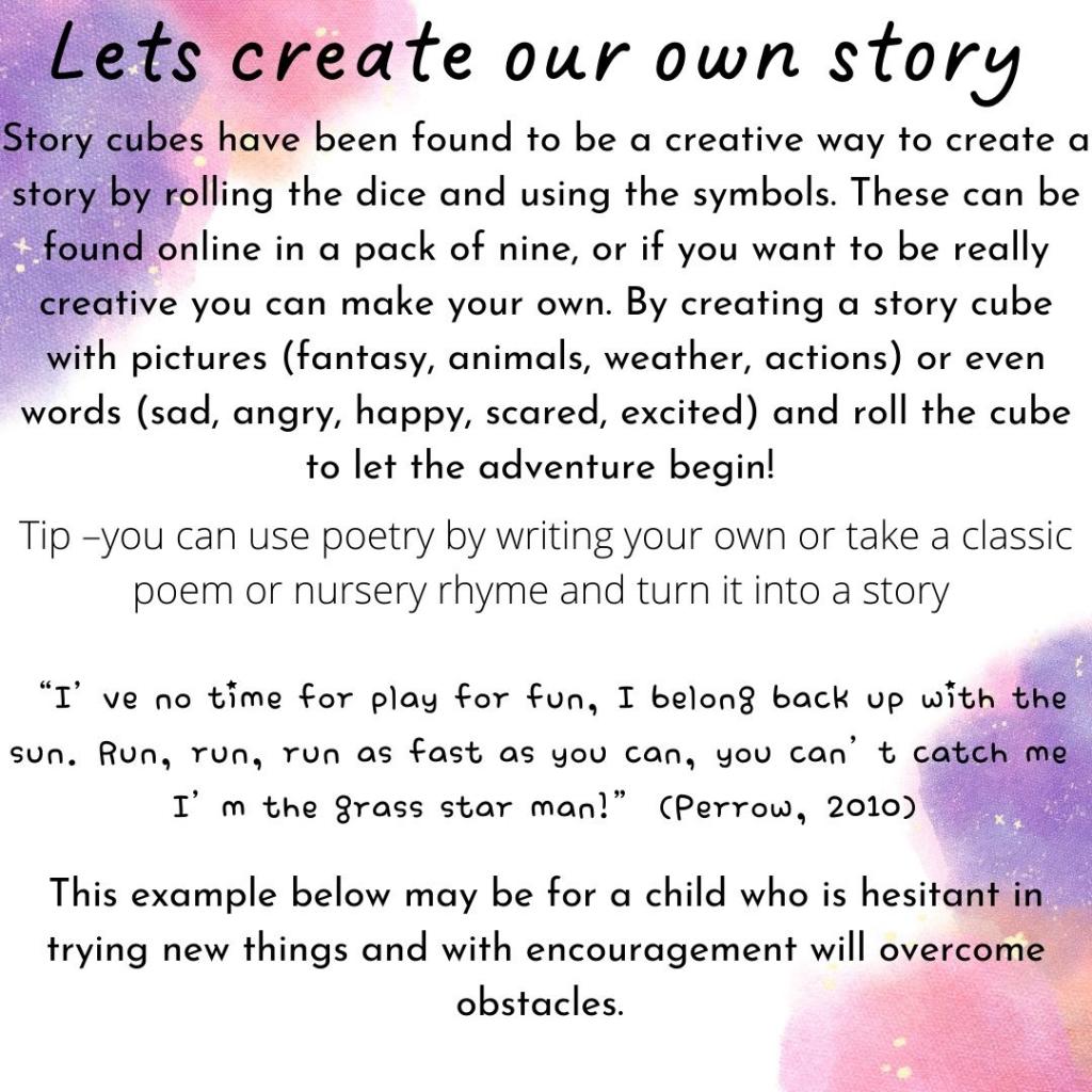 Story cubes have been found to be a creative way to create a story by rolling the dice and using the symbols. These can be found online in a pack of nine, or if you want to be really creative you can make your own. By creating a story cube with pictures (fantasy, animals, weather, actions) or even words (sad, angry, happy, scared, excited) and roll the cube to let the adventure begin!