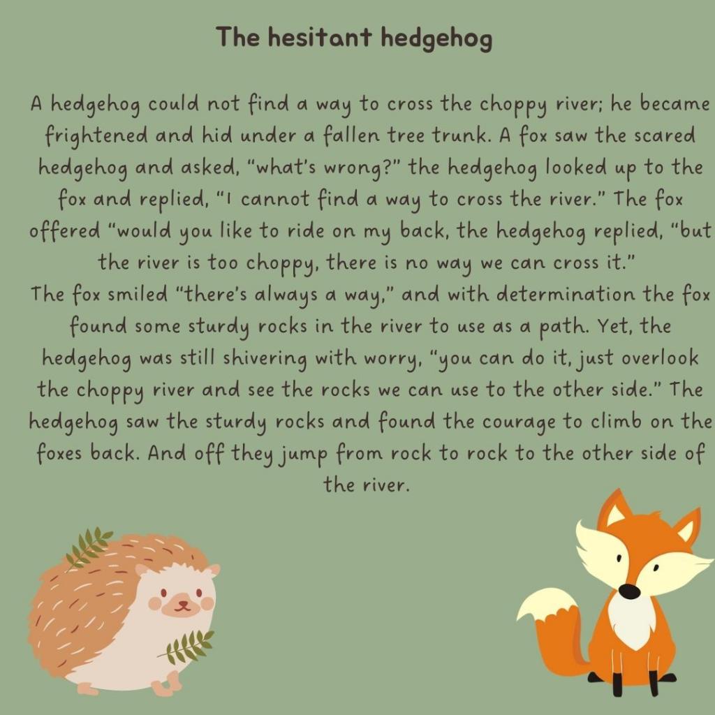 A hedgehog could not find a way to cross the choppy river; he became frightened and hid under a fallen tree trunk. A fox saw the scared hedgehog and asked, “what’s wrong?” the hedgehog looked up to the fox and replied, “I cannot find a way to cross the river.” The fox offered “would you like to ride on my back, the hedgehog replied, “but the river is too choppy, there is no way we can cross it.” The fox smiled “there’s always a way,” and with determination the fox found some sturdy rocks in the river to use as a path. Yet, the hedgehog was still shivering with worry, “you can do it, just overlook the choppy river and see the rocks we can use to the other side.” The hedgehog saw the sturdy rocks and found the courage to climb on the foxes back. And off they jump from rock to rock to the other side of the river.