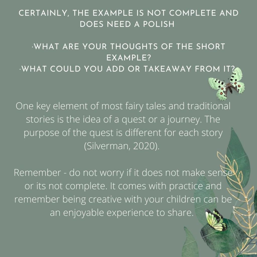 One key element of most fairy tales and traditional stories is the idea of a quest or a journey. The purpose of the quest is different for each story (Silverman, 2020).