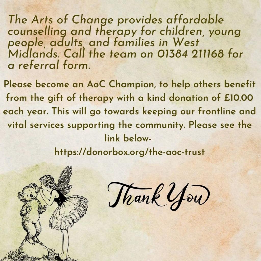 Please become an AoC Champion, to help others benefit from the gift of therapy with a kind donation of £10.00 each year. This will go towards keeping our frontline and vital services supporting the community. Please see the link below-