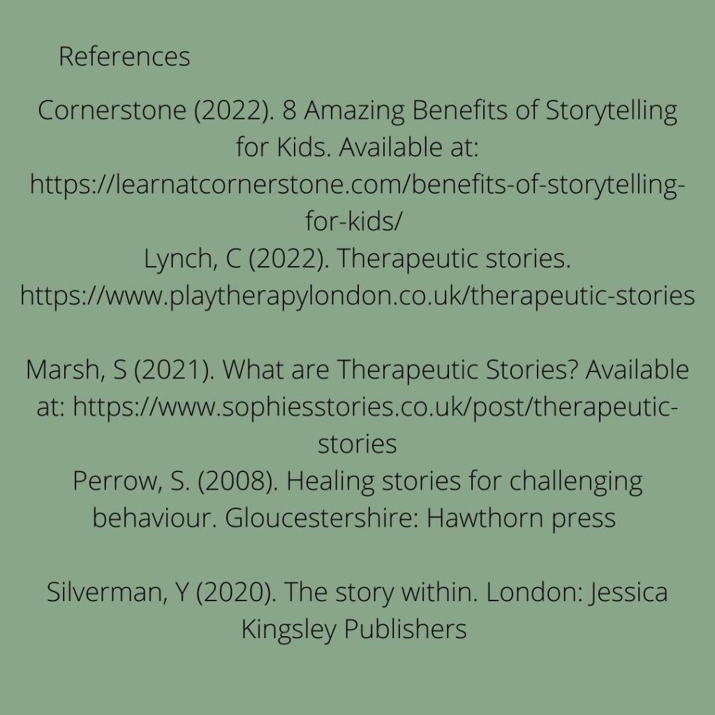 Marsh, S (2021). What are Therapeutic Stories? Available at:  https://www.sophiesstories.co.uk/post/therapeutic-stories