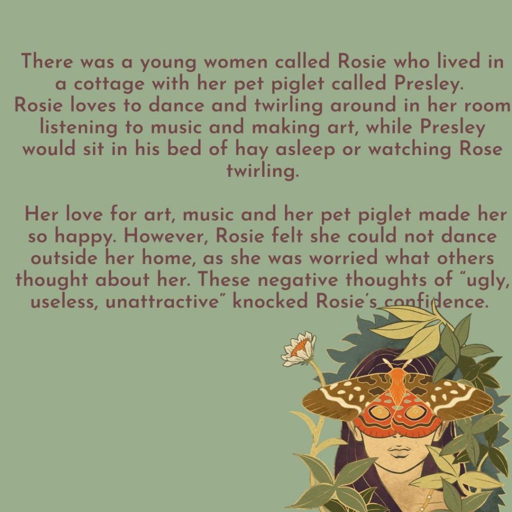 There was a young women called Rosie who lived in a cottage with her pet piglet called Presley. Rosie loves to dance and twirling around in her room listening to music and making art, while Presley would sit in his bed of hay asleep or watching Rose twirling. Her love for art, music and her pet piglet made her so happy. However, Rosie felt she could not dance outside her home, as she was worried what others thought about her. These negative thoughts of “ugly, useless, unattractive” knocked Rosie’s confidence.