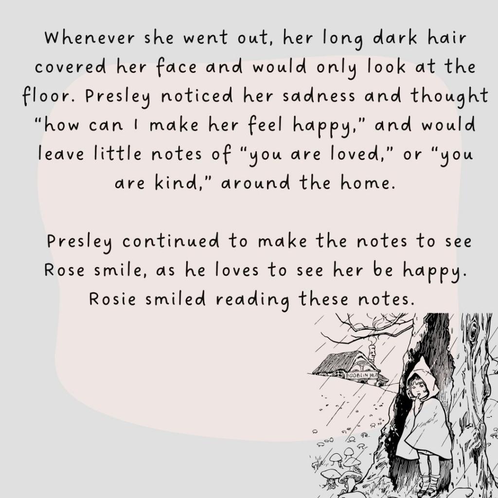 Whenever she went out, her long dark hair covered her face and would only look at the floor. Presley noticed her sadness and thought “how can I make her feel happy,” and would leave little notes of “you are loved,” or “you are kind,” around the home. Presley continued to make the notes to see Rose smile, as he loves to see her be happy. Rosie smiled reading these notes.