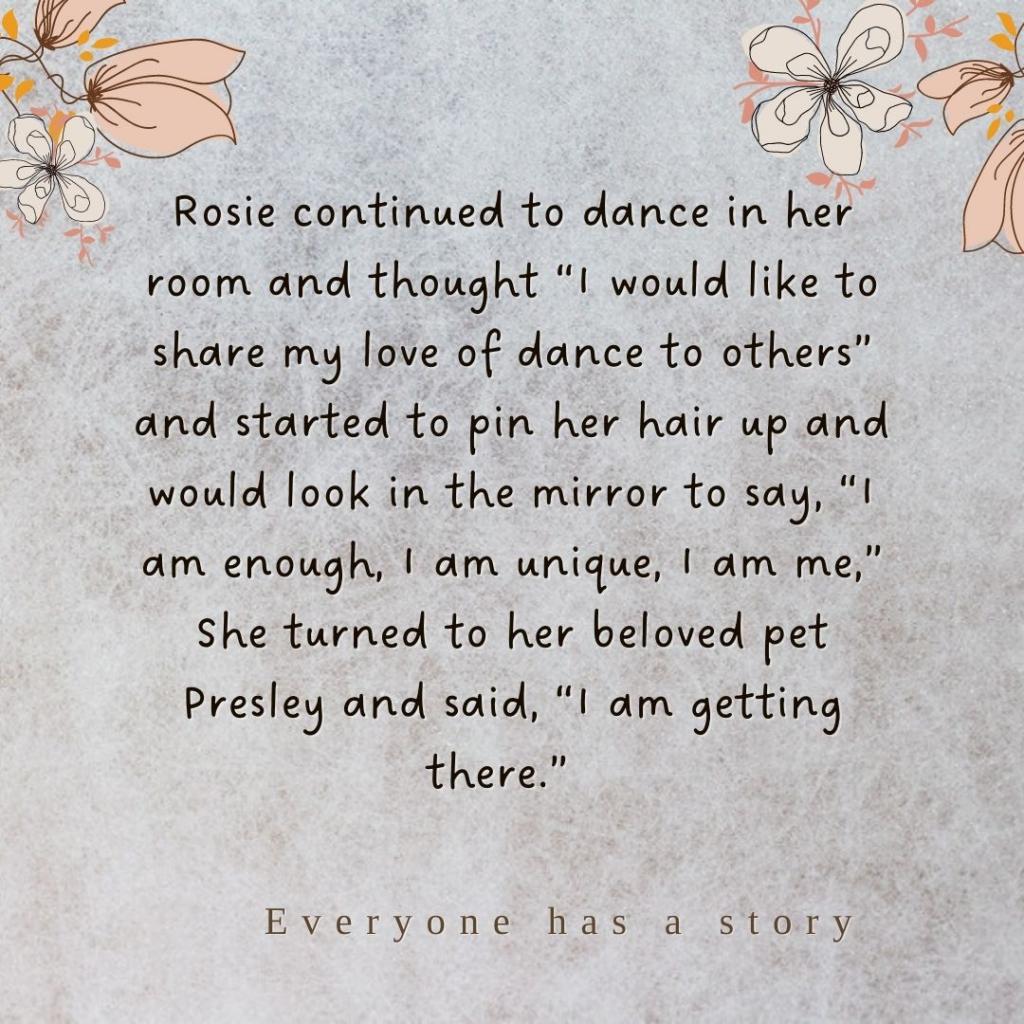 Rosie continued to dance in her room and thought “I would like to share my love of dance to others” and started to pin her hair up and would look in the mirror to say, “I am enough, I am unique, I am me,” She turned to her beloved pet Presley and said, “I am getting there.”