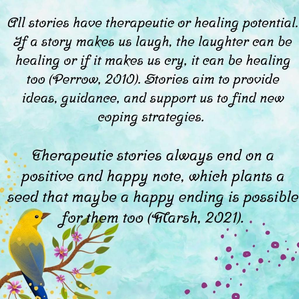Therapeutic stories always end on a positive and happy note, which plants a seed that maybe a happy ending is possible for them too (Marsh, 2021).