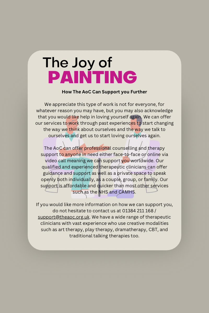 Here at the AoC, we are passionate about unlocking the creativity within you. Our West Midlands studios and facilities are located in the heart of the Black Country. We offer a safe, confidential and supportive counselling and creative art therapy service to our clients across the UK.